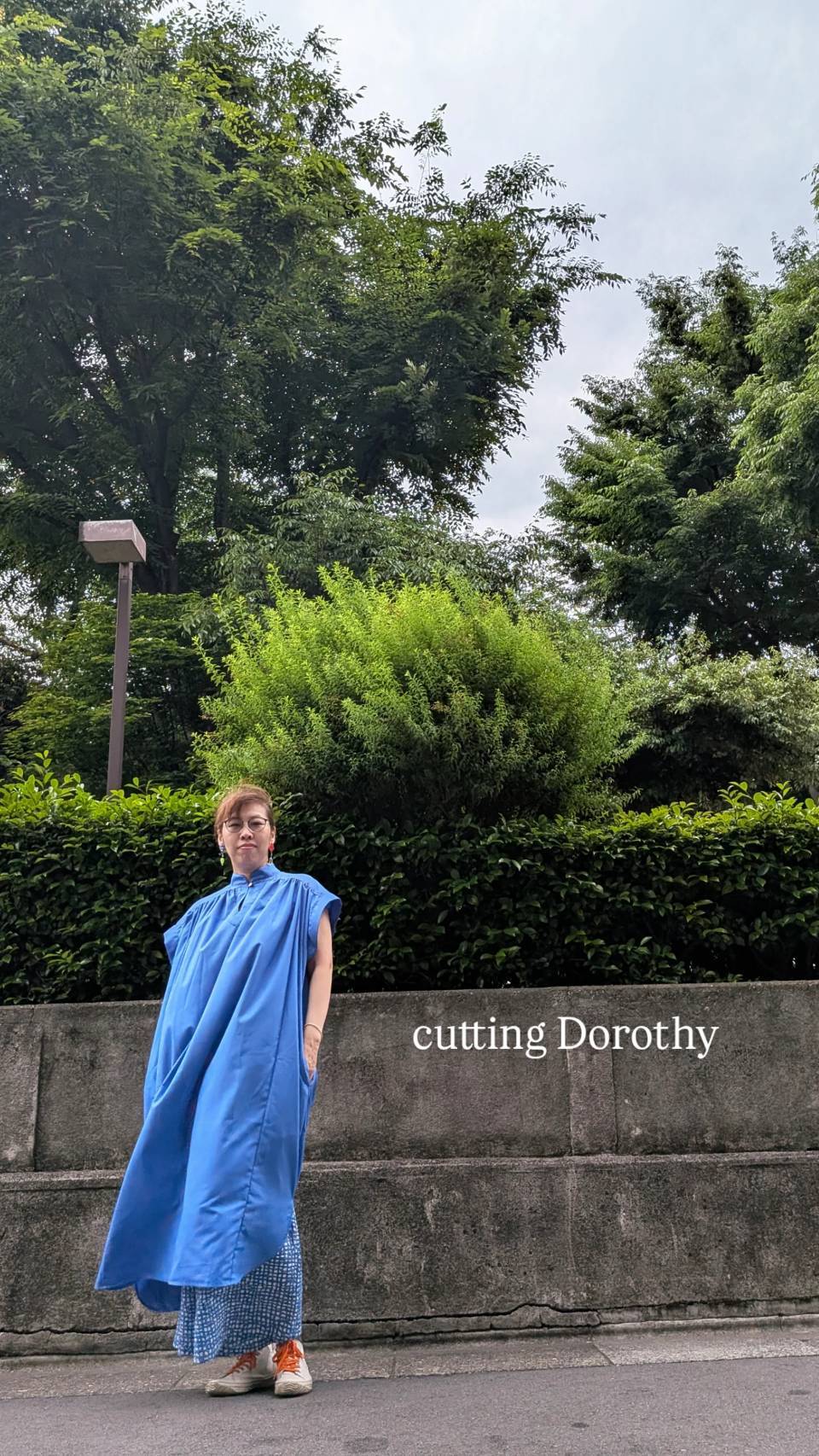 肩にあるパイピングをラベンダーとブルーのストライプ生地にしているのが1ポイントです。