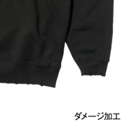 本ページには写真を掲載しておりませんが、同じプリントのスウェットシャツ(CFBS0031)と同様のダメージ加工を、フード・袖口・裾・ポケットに追加することも可能です。