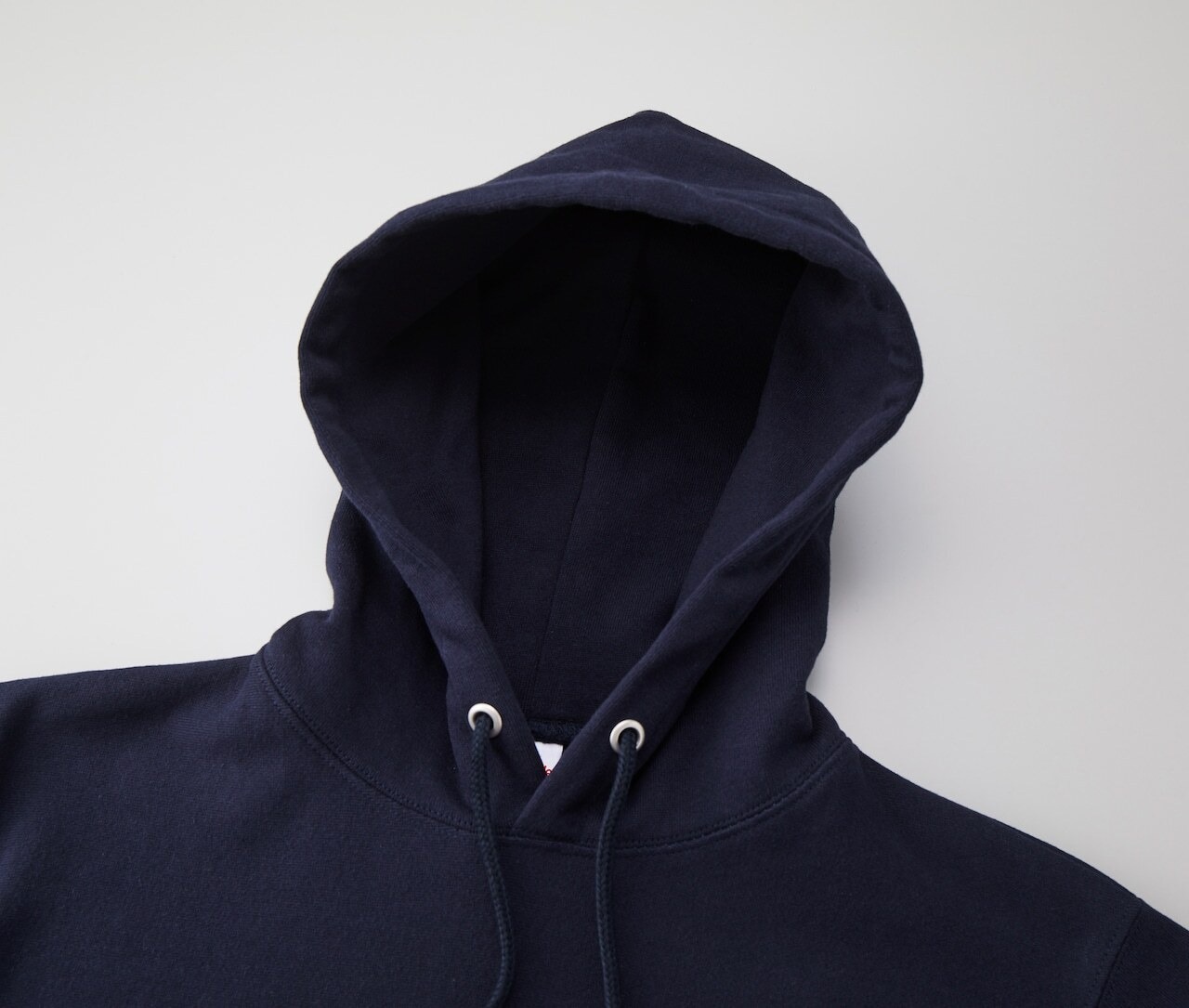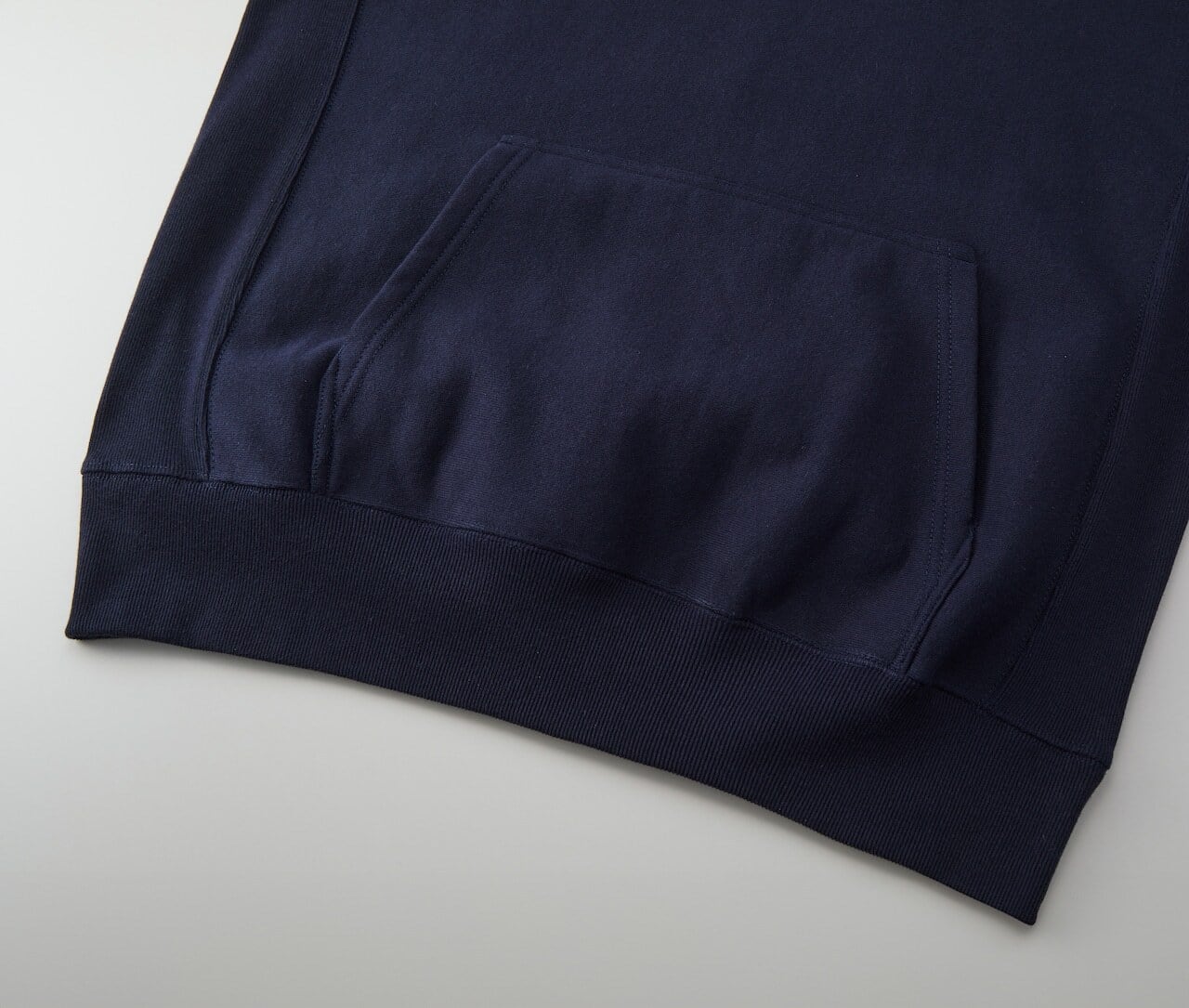 身頃の生地目は横取り、脇はリブ生地のサイドパネル仕様で、オープンエンド糸の持つ独特の風合いにより、味のある「ムラ感」と「ザラ感」を楽しむことができる、スウェット好きも納得のボディを使用した厚手フーディーです。
