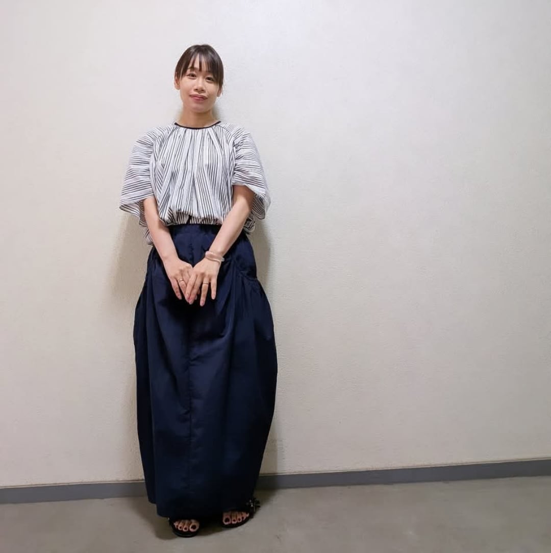 裾は長めなのでボトムにインしたり、ベルトマークするのがおすすめです。