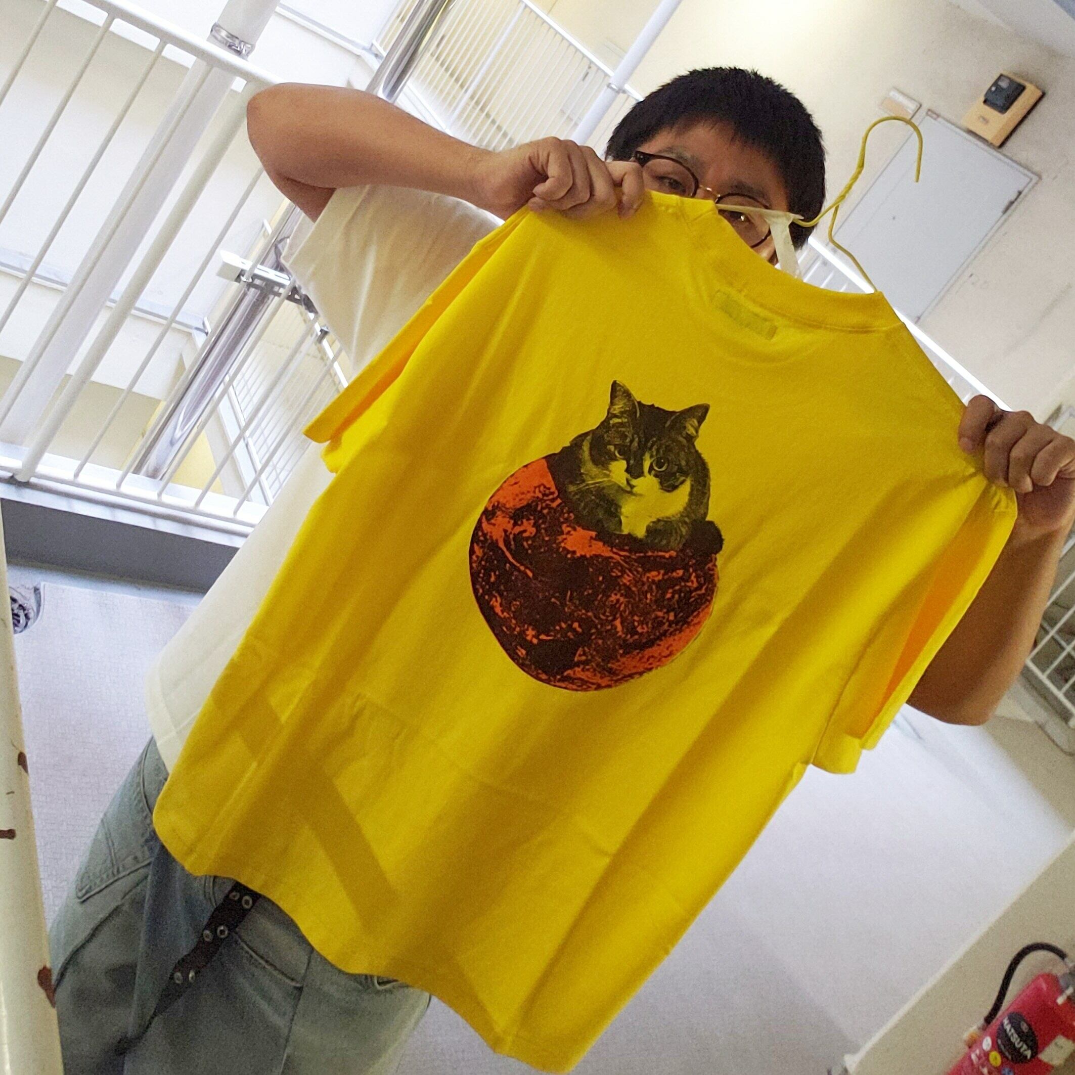 惑星の上に猫が乗っているグラフィックの、Tシャツです。