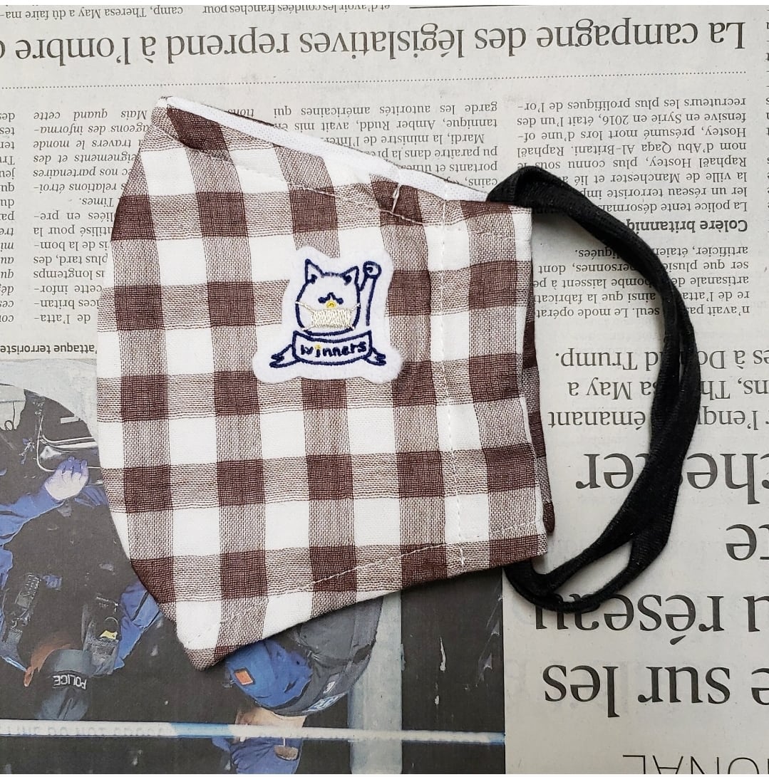 HOASHIYUSUKE(ホアシユウスケ)の、"コロナに勝ったネコ"のワッペンがくっついた布マスクになります。