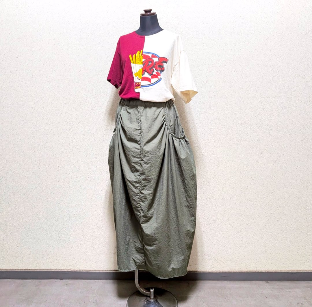 左右大きさの違うTシャツを組み合わせているため、丈や肩幅がアシンメトリーになっています。